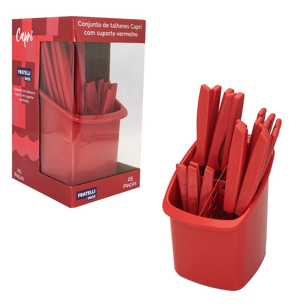 Conjunto de Talheres Capri 25 Peças – Vermelho Composto por talheres duráveis e de alta qualidade, esse conjunto irá adicionar um toque de elegância a qualquer ocasião. Seu acabamento vermelho fosco proporciona um visual moderno e sofisticado. Contando com 25 peças, sendo elas: 6 facas, 6 colheres, 6 garfos, 6 colheres de chá e 1 suporte, o conjunto é completo e versátil, você terá à disposição colheres, colheres de sobremesa, garfos e facas para atender a todas suas necessidades, desde almoços casuais até jantares formais.Além do seu design impecável, os talheres são ergonomicamente projetados para um manuseio confortável, com seu peso equilibrado e suas bordas suavemente arredondadas proporcionam uma experiência de uso agradável, garantindo que cada garfada ou corte sejam perfeitos. Fabricados com materiais de alta qualidade, os talheres são resistente e duráveis, o aço inox não enferruja, são projetados para o uso diário e manter o brilho por muito tempo, além do seu acabamento torna-los fáceis de limpar, permitindo que você desfrute de sua refeição sem se preocupar com a limpeza.