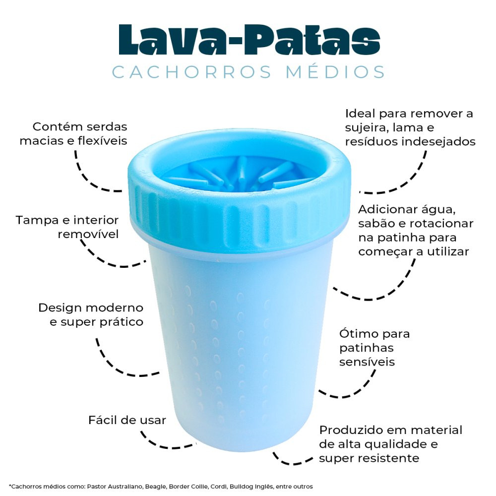 A solução perfeita para manter as patinhas do seu animalzinho limpas e saudáveis!Com um design moderno, prático e eficiente, este lava patas é ideal para remover a sujeira, lama e resíduos indesejados das patas do seu pet após os passeios ao ar livre.Sendo compacto e fácil de usar, basta apenas colocar a pata do pet dentro do recipiente, adicionar água e rotacionar para que as cerdas façam toda a limpeza sem esforço, é perfeito para o uso doméstico ou em viagens, garantindo que as patas do pet estejam sempre limpas e livre de germes.Feito com cerdas macias e flexíveis, é suave o suficiente para as patinhas sensíveis do seu pet, proporcionando uma experiência de limpeza confortável e livre de estresse, além da sua durabilidade e resistência, podendo ser utilizada sem preocupações. -Cachorros médios como: Pastor Australiano, Beagle, Border Collie, Cordi, Bulldog Inglês, entre outros;-Tampa e interior removível. ESPECIFICAÇÕES:Material: PP e SiliconeDimensões: Diâmetro: 9cm x Comprimento: 11cmCor: AzulPeso: Aprox. 165g CONTÉM:01 LAVA PATAS PARA CACHORROS MÉDIOS