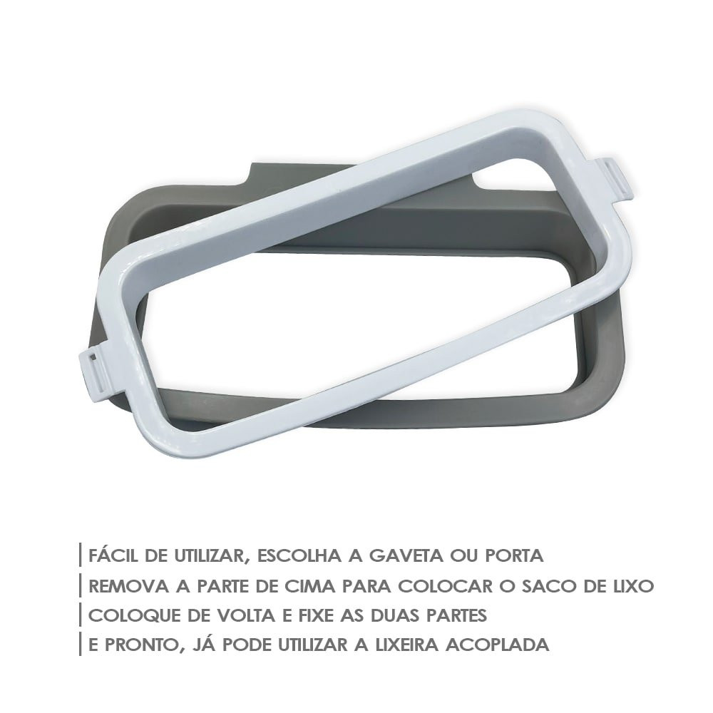 Material: Plástico reforçado- Dimensões: 10cm largura x 20cm comprimento – Após encaixar no local desejado, coloque o saco de lixo; Encaixe a outra parte para prender o saco e está pronto para uso!