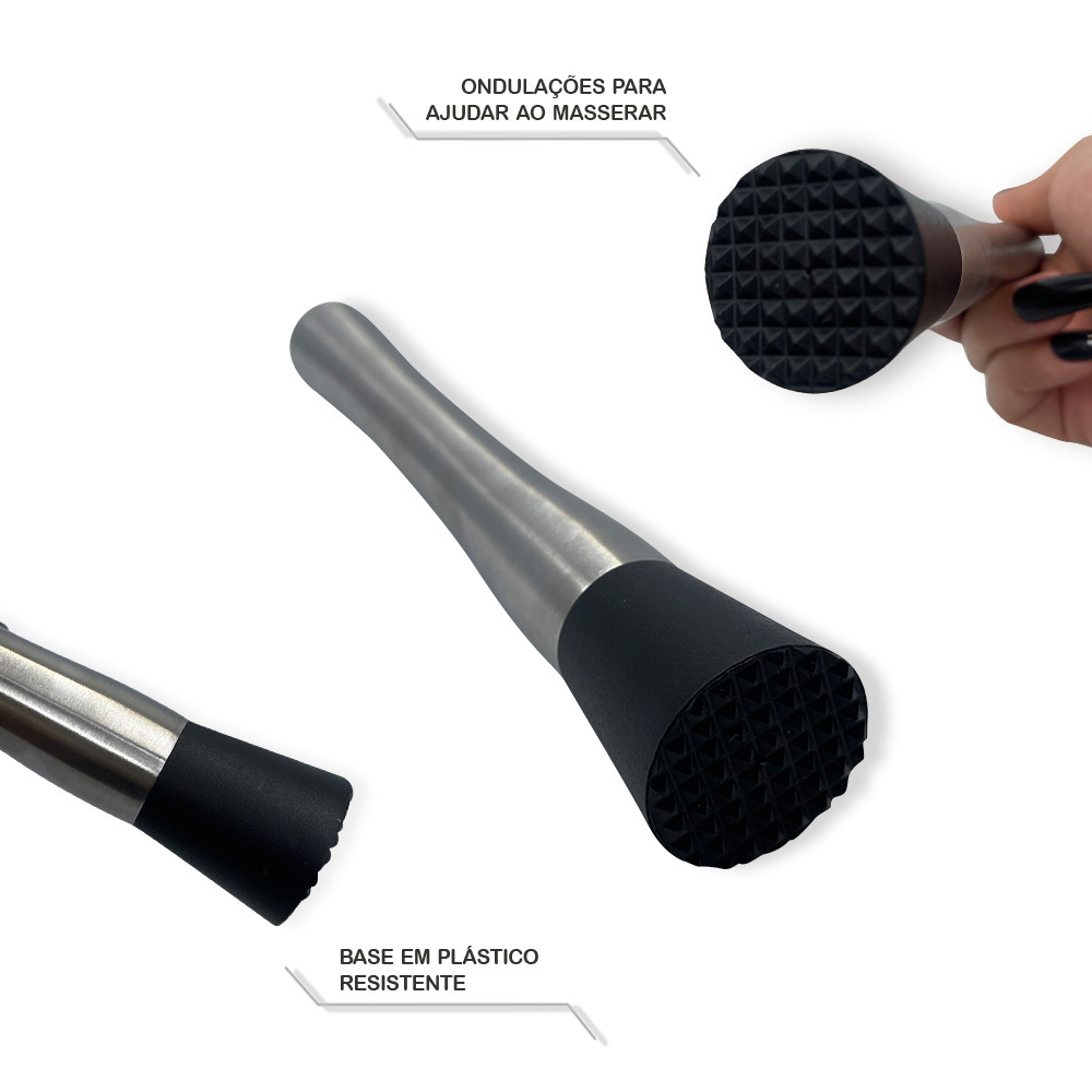 Socador Macerador para Drinks Essa macerador é ideal para você que deseja fazer drinks mais peofissionais com muita praticidade. Prepare drinks saborosos para seus amigos e familiares. O produto pode atender várias necessidades na cozinha, pode usar para quebrar gelo, amassar temperos e principalmente para macerar frutas para drinks. Feito em Aço Inox torna o produto mais resistente e duradouro, além de ter um design elegante. Com base revestida em plástico não corre risco de quebrar o copo.